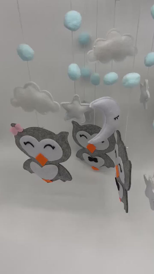 Handmade Felt Pink/Blue Owl, Moon, and Cloud Nursery Mobile, Crib Mobile, Baby Room Decoration, Cot Mobile,