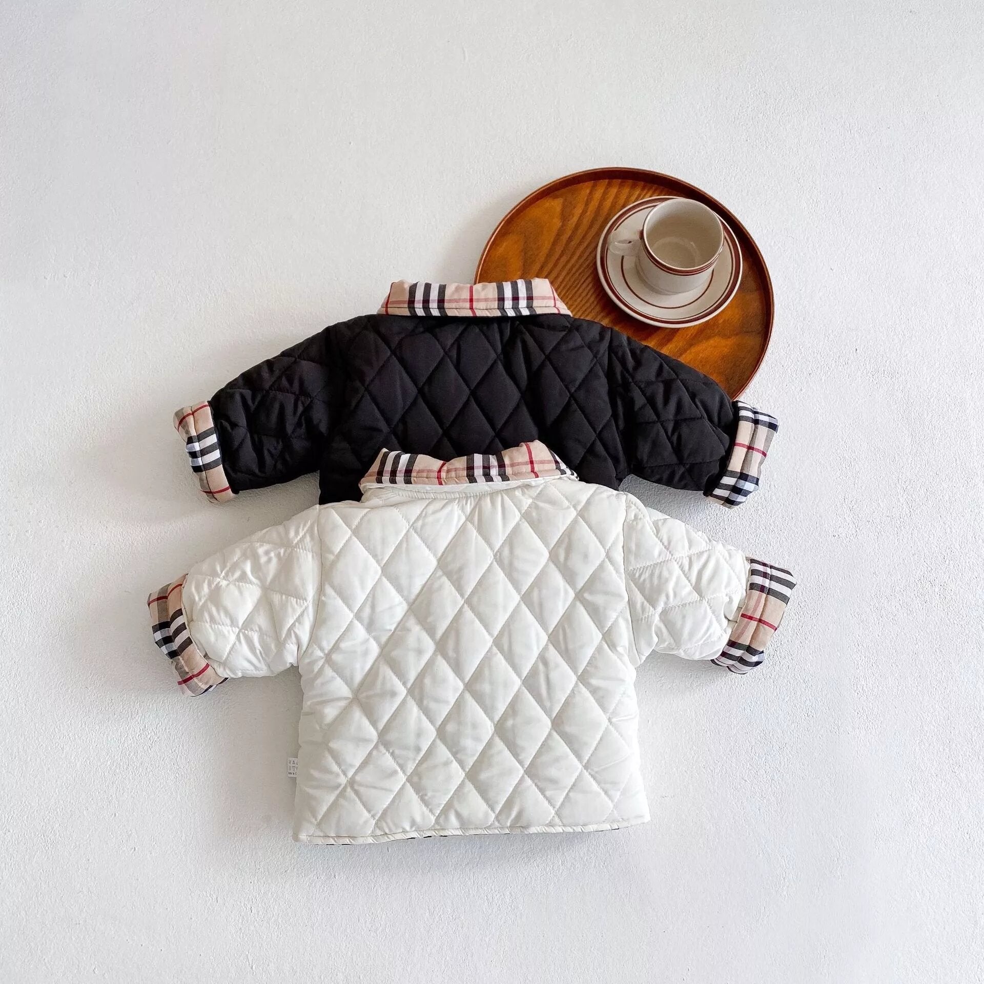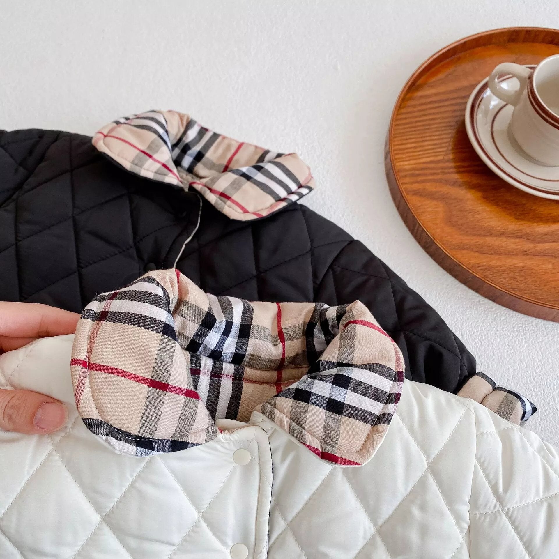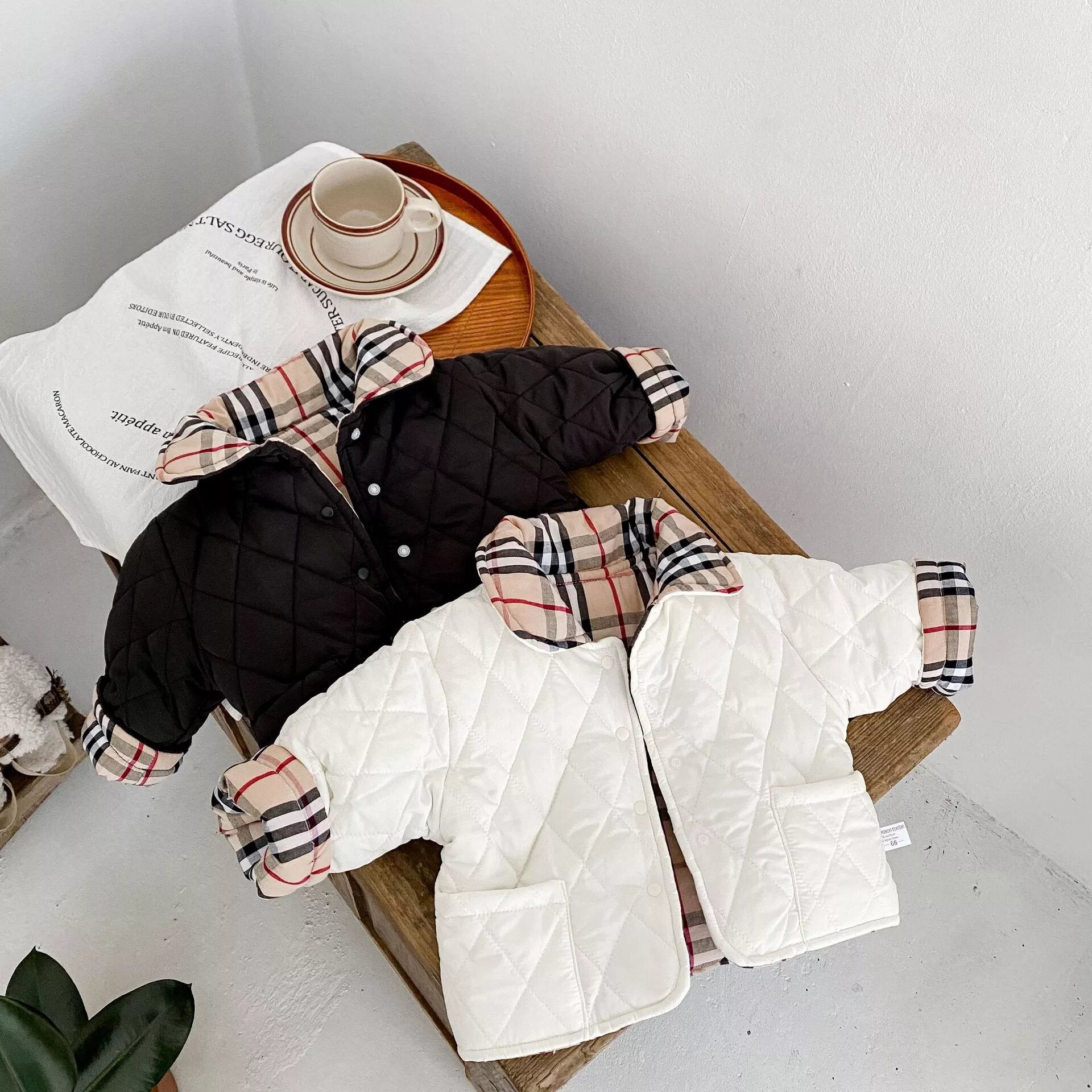 This Cute and Elegant Coat comes in 2 colors Black and White/Plaid. The coat is two-sided and both sides can be used with two cute pockets.