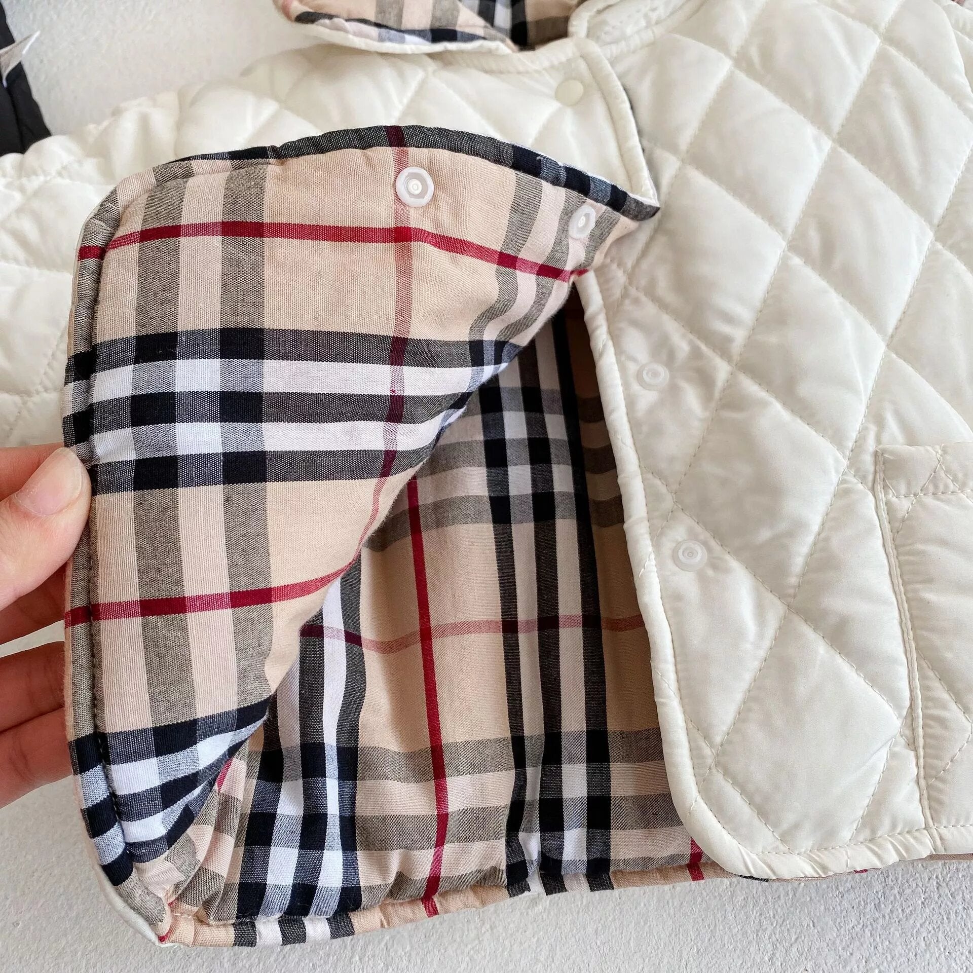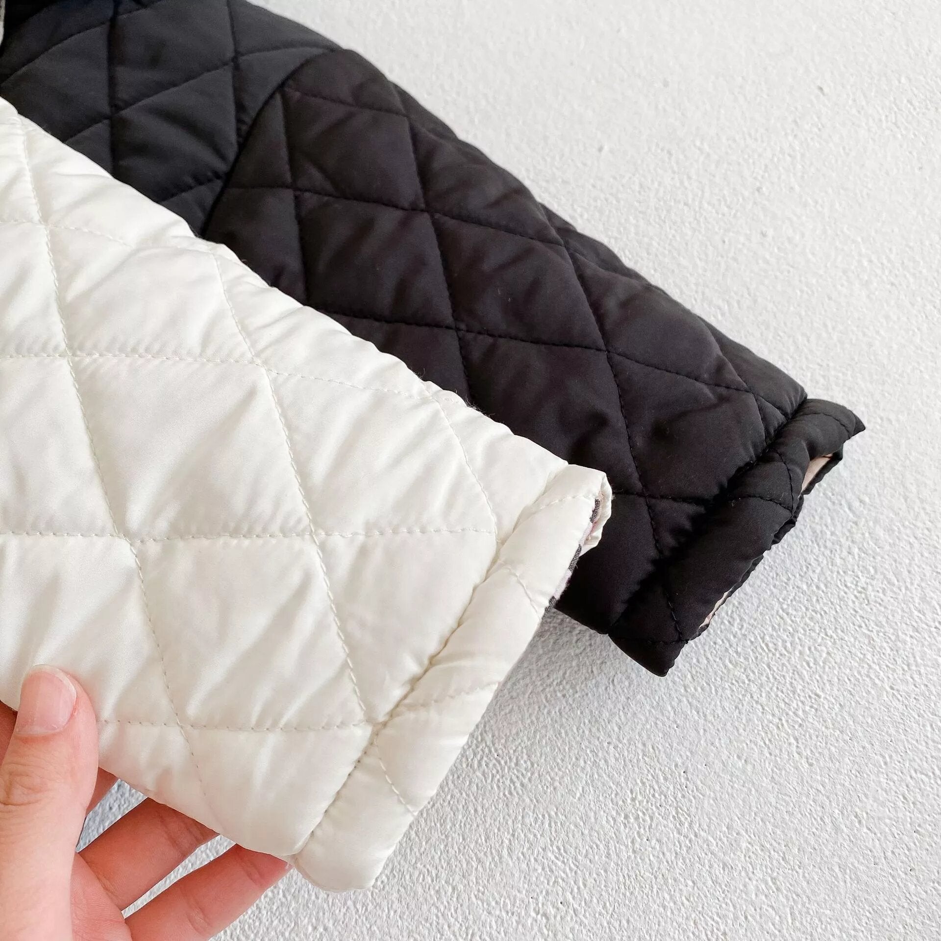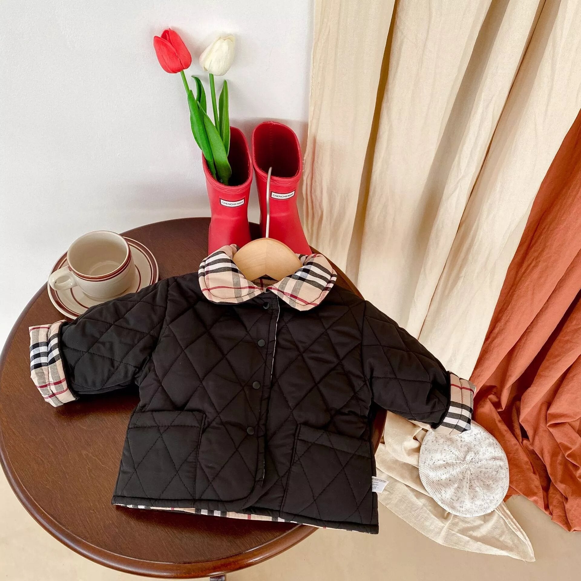 This Cute and Elegant Coat comes in 2 colors Black and White/Plaid. The coat is two-sided and both sides can be used with two cute pockets.
