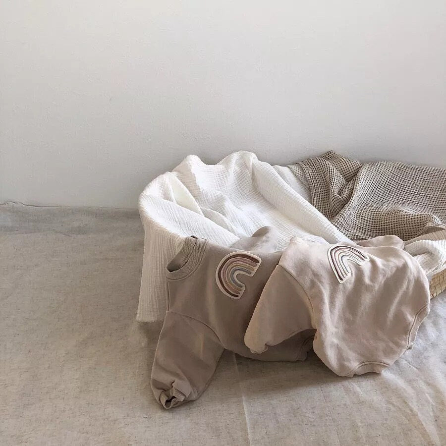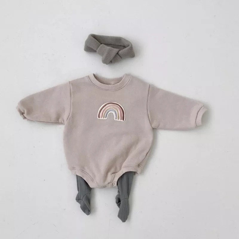 Elevate your little one's style with our Rainbow Sweatshirt Romper—a whimsical blend of comfort and charm. This oversized bubble sweatshirt, adorned with a playful rainbow design, brings joy to your baby or toddler's wardrobe. In sophisticated beige and brown tones, this romper is perfect for every occasion. Available in sizes from newborn to 24 months, it ensures a perfect fit as your child grows. Not only is it a cozy choice for all-day wear, but it also features an easy snap closure for hassle-free diaper changes. Make a lasting impression with this delightful romper, an ideal baby shower or first birthday gift.